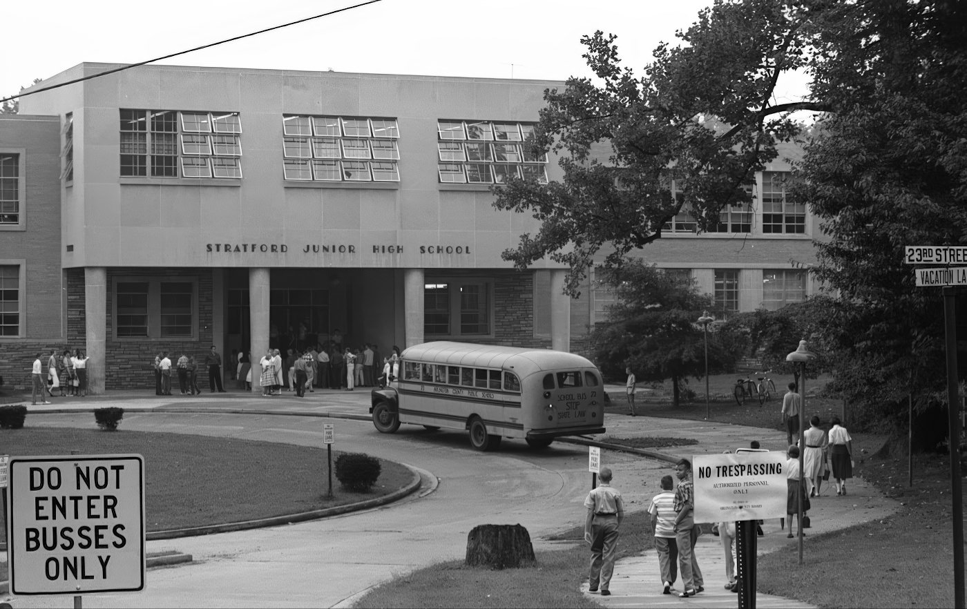 On February 2, 1959, four Black students—Ronald Deskins, Michael Jones, Gloria Thompson, and Lance Newman—entered Stratford Junior High School, making it the first public school in Virginia to desegregate. This event was widely noted for passing “without incident”. Despite this breakthrough, Arlington’s public schools continued to integrate slowly. The County School Board even ended school dances and athletic events after integration began in 1959. Arlington’s experience with school desegregation showcased its unique position as a Northern Virginia county caught between state-level “Massive Resistance” and local pressures. This ultimately made Arlington a pioneer in Virginia’s desegregation efforts, highlighting the complex legal and social battles fought at the local level.